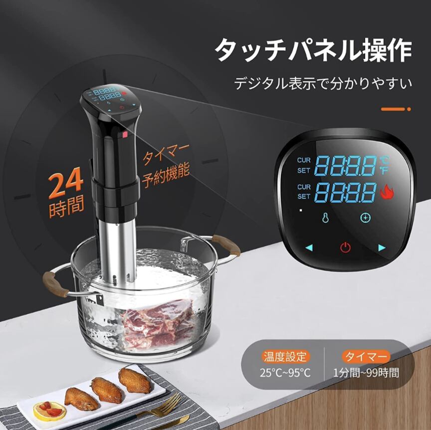 低温調理器 1100Wハイパワー 低温調理器具 24時間 予約機能 真空調理器 スロークッカー レシピ付き 低温調理 IPX7防水 タッチパネル クリップ式 低温調理機 低音調理器 タイマー 温度設定 五重安心保護 日本語取扱説明書 | 和食革命