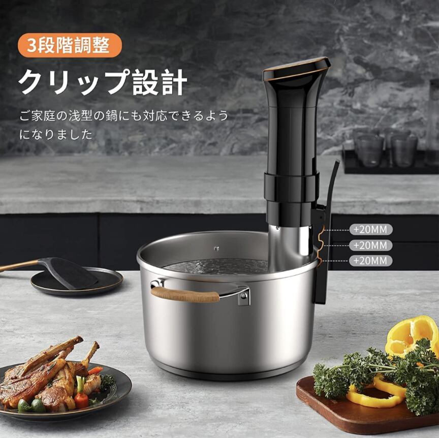 【可調整プレスタイプクリップ 使いやすさ】プレスタイプクリップに滑り止めシリコンパッドを加えて、より安定して脱落しにくい低温調理器でき上がる。 3段階可調整によって、高さが異なる調理容器を使っても簡単に対応可能。ネジで固定されるタイプの調理器より手間が省ける。 精密調理器を任意の鍋や容器に取り付け、鍋や容器に水を入れ、密封された袋に食べ物を入れ、タッチパネル操作で料理を応じて温度と時間を設定して「ほっとく」時間を待つだけ。