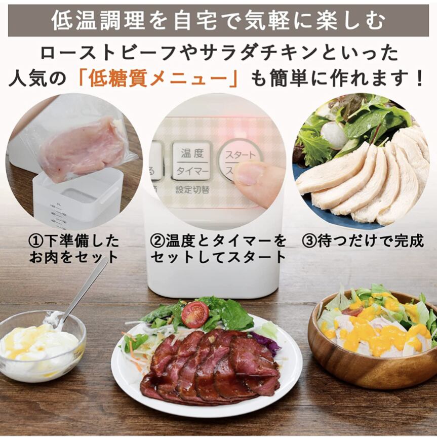 ヨーグルトや発酵食品のほか、低温調理ができるので、ローストビーフやサラダチキンなどを作ることができます。