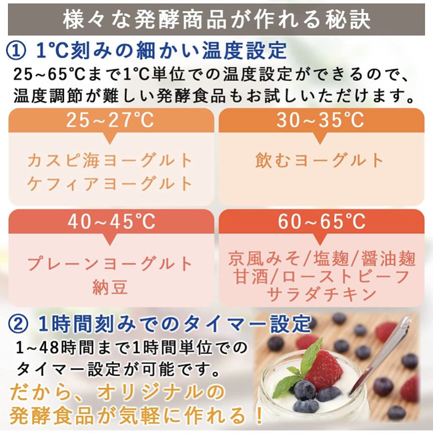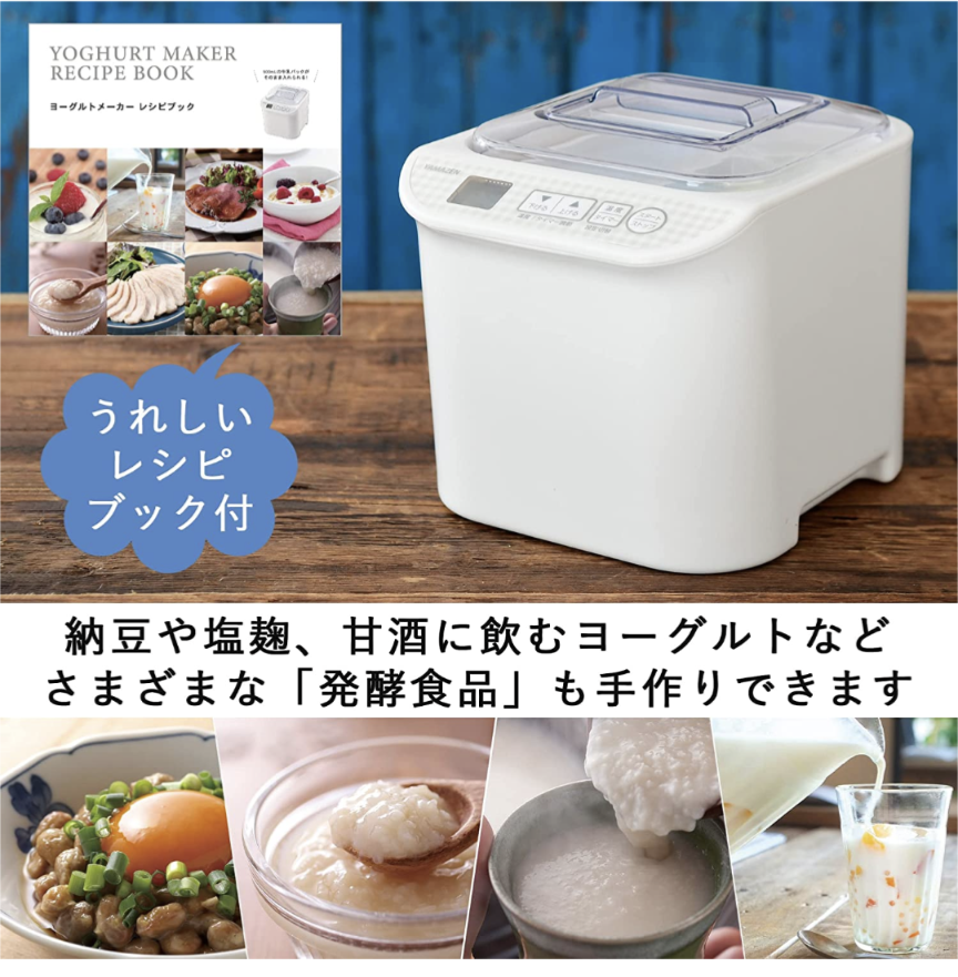 京風白みそや納豆、塩麹、甘酒などの発酵食品、またプレーンヨーグルトのほか、カスピ海ヨーグルトやケフィアヨーグルト、飲むヨーグルトなど、さまざまな発酵食品を手作りできます。