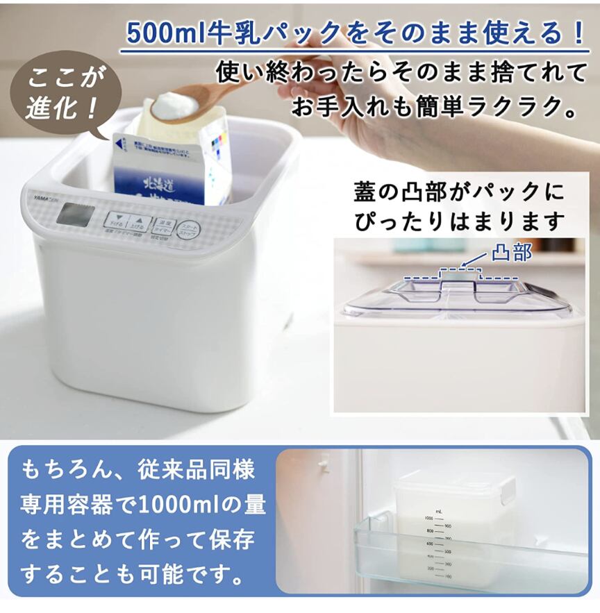 ヨーグルトは、牛乳と市販のヨーグルトを混ぜて調理します。専用容器が付属されていますが、500mLの牛乳パックをそのまま使うこともできます。